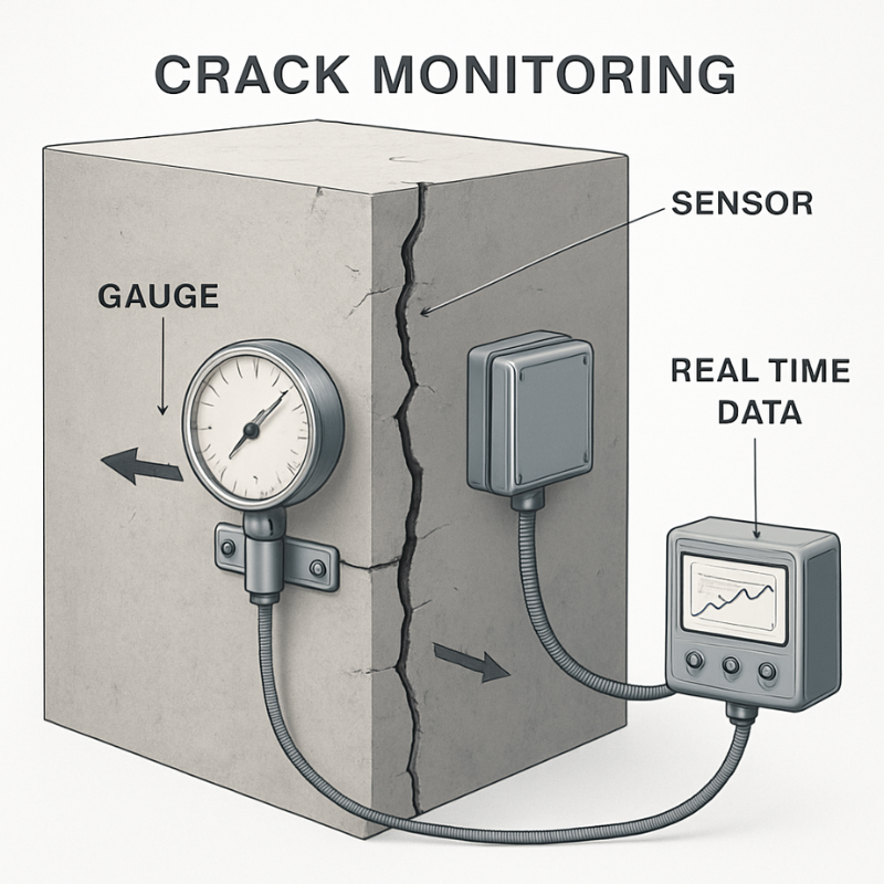 Techniques for crack monitoring include visual inspections, mechanical gauges, strain sensors, digital displacement sensors, and automated data logging systems. Data collected allows precise measurement of crack width, depth, and growth patterns. By analyzing this data, engineers can make informed decisions on structural repairs, reinforcement, and preventive measures, enhancing safety, durability, and long-term asset management.