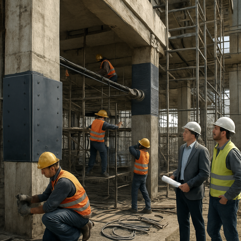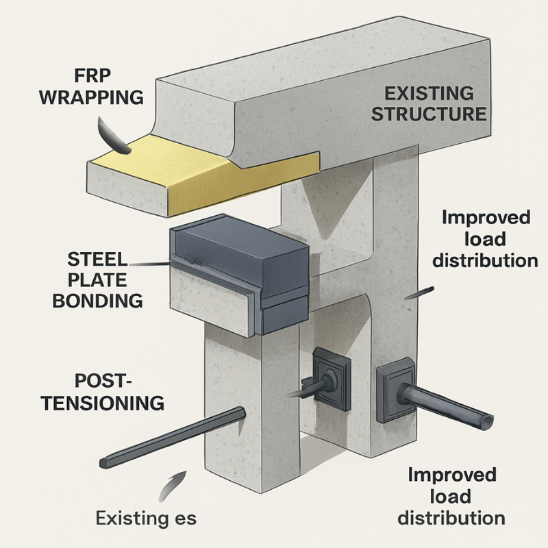 Strengthening techniques include fiber-reinforced polymer (FRP) wrapping, steel plate bonding, post-tensioning, grouting, and concrete jacketing. The choice of method is based on structural assessment, load requirements, and environmental conditions. Properly executed strengthening improves resilience against seismic activity, heavy loads, and environmental degradation, providing a cost-effective solution for long-term structural reliability.