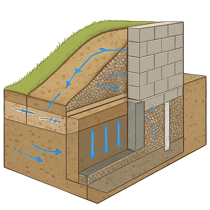 Effective water management is the first defense against ground instability. Our drainage solutions are custom-engineered systems designed to not just divert water, but to permanently eliminate hydrostatic pressure and saturation risks. By combining precision engineering with a deep understanding of subsurface conditions, we create robust systems that protect your assets, prevent erosion, and ensure the long-term safety and integrity of your site.